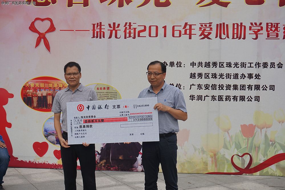 2016年8月23日,由中共越秀區(qū)珠光街工作委員會(huì)、越秀區(qū)珠光街辦事處主辦,華潤廣東醫(yī)藥有限公司、廣東安信投資集團(tuán)有限公司協(xié)辦的《慈善珠光 愛心同行——珠光街2016年愛心助學(xué)暨慈善為民活動(dòng)》,在越秀區(qū)仰忠廣場舉行。華潤廣東醫(yī)藥有限公司黃揚(yáng)文高級(jí)副總經(jīng)理出席了本次活動(dòng),并代表公司將陳威廉副董事長提供的愛心助學(xué)基金贈(zèng)與珠光街慈善基金,該基金將為珠江街近30位低收入、低保等困難家庭的大中專學(xué)生提供學(xué)業(yè)資助。